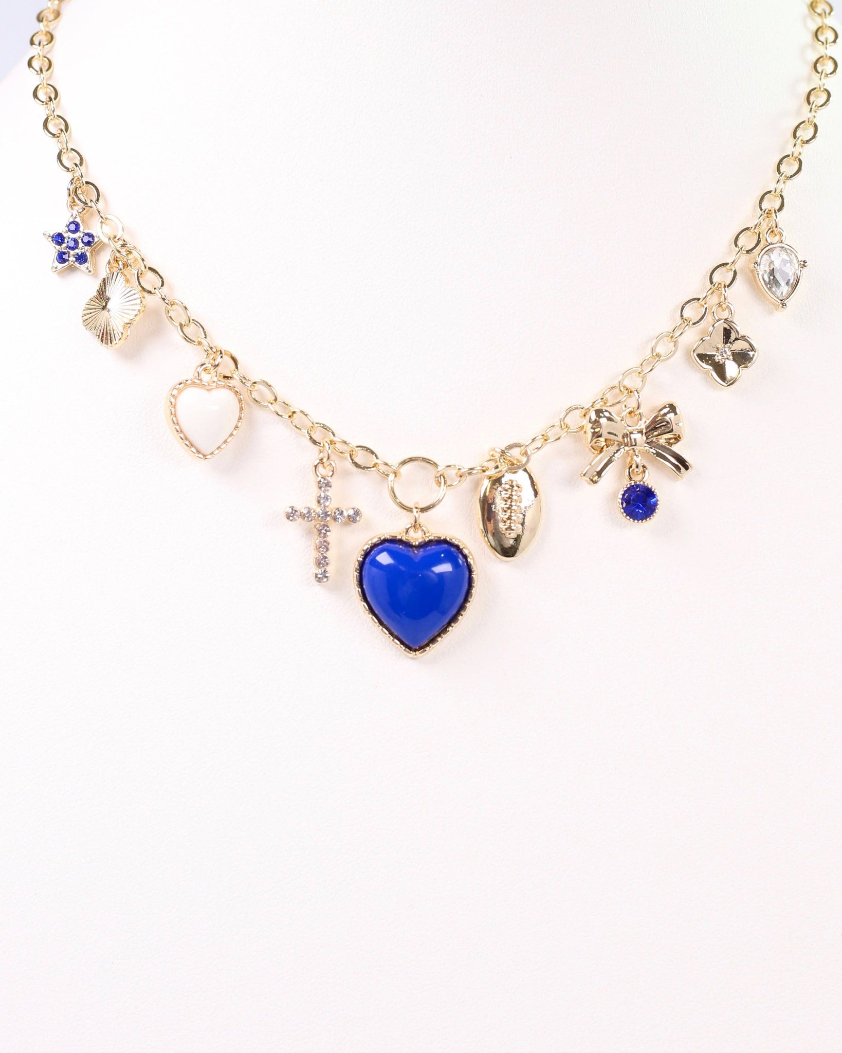 Celebrate game day in style with the Bentley Charm Necklace in royal blue and white. This fashionable piece features two heart charms in your team colors, a football charm, and a variety of other playful accents. Perfect for showing your spirit with a chic touch, it’s a must-have accessory for every fan looking to combine passion and trend effortlessly.