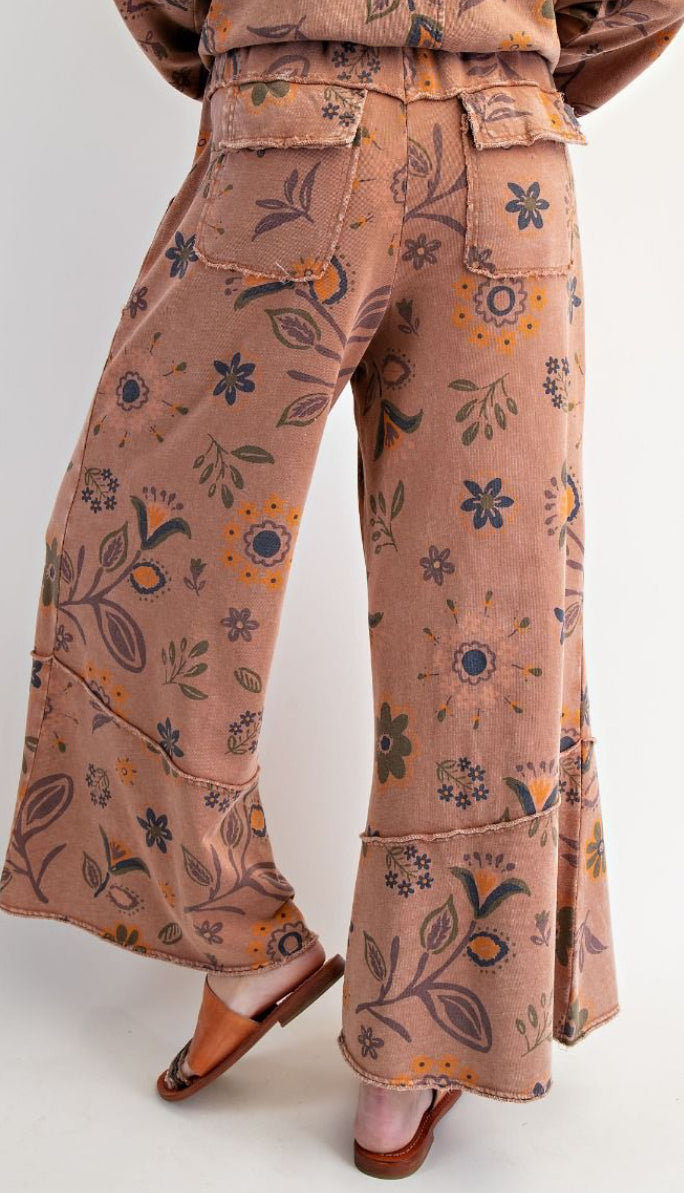 FLORAL PRINTED WASHED TERRY PANTS-WIDE LEG SILHOUETTE-DRAWSTRING WAISTBAND-EXPOSED SEAMING-DEEP FRONT AND BACK PATCH POCKETS-ALL OVER FLORAL PRINT-SMALL MEASUREMENTS : INSEAM - 25.5"