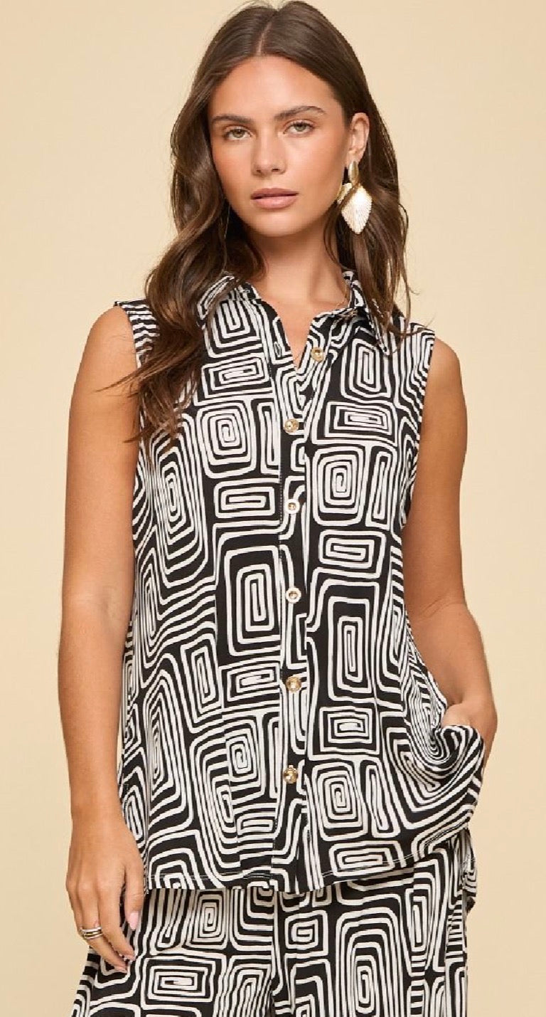 This stylish two-piece set is perfect for warm summer days or your next getaway. Featuring a sleeveless blouse with collar detailing and relaxed, loose-fitting pants, it combines comfort and effortless style. Thoughtful button details complete the look for a polished, put-together outfit.