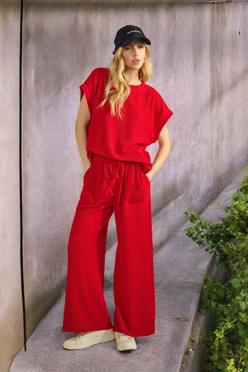 This cozy two-piece rib knit lounge set features a relaxed oversized top with dolman sleeves and matching wide leg pants with an elastic drawstring waist. The subtle vertical stripe pattern adds a touch of texture, while the buttery-soft fabric delivers all-day comfort. Whether you're styling it as casual wear, travel wear, or an elevated take on loungewear sets, this outfit is effortlessly chic and endlessly versatile. Perfect for customers looking for matching sets, ribbed knit outfits, wide leg loungewear, or everyday comfy sets. INSEAM: 26 1/2"