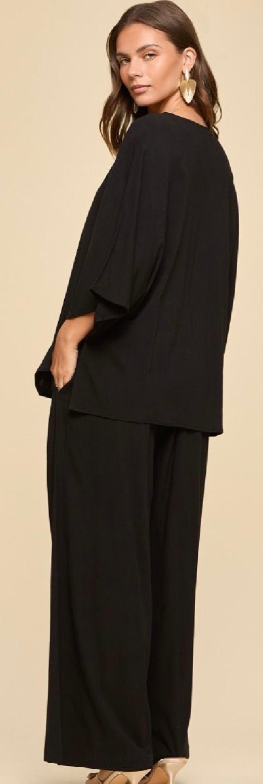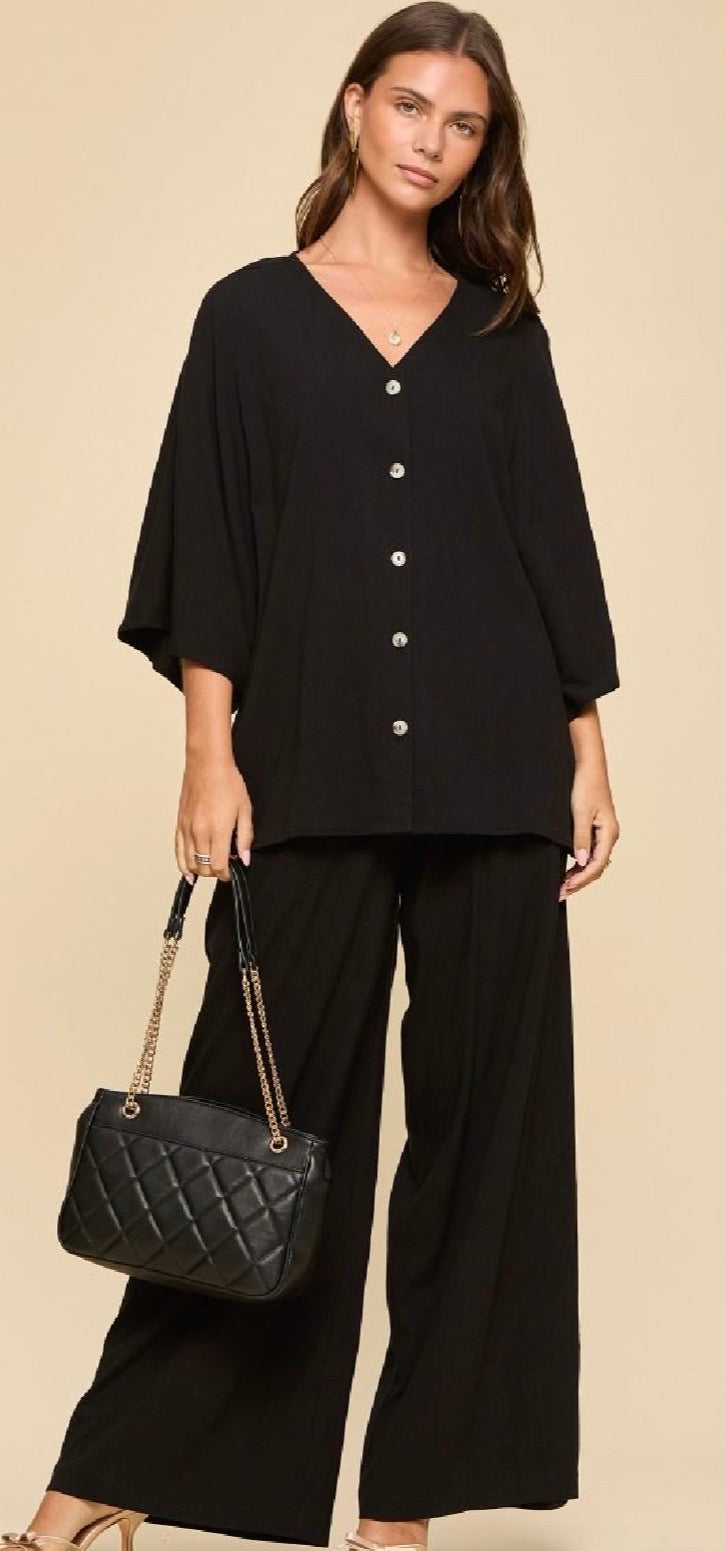 This beautiful linen set is perfect for your get away vacation! We love the button details on front with elastic pants! It's chic, fashionable, and easy to wear! Non sheer, woven. Black in sizes small-3X. SET