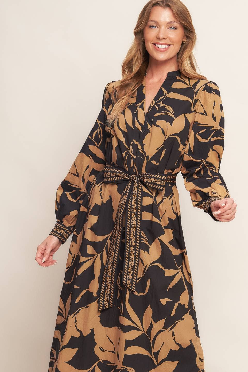 A printed woven midi dress featuring high neckline with V front, short puff sleeve and self-sash tie Details: Self : 100% Cotton
