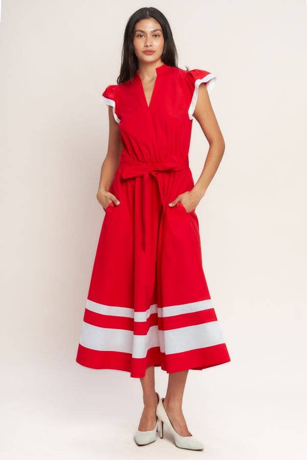 A solid woven color blocked midi dress featuring V neckline, ruffle sleeve, elasticized waist and self-sash tie.100% Cotton