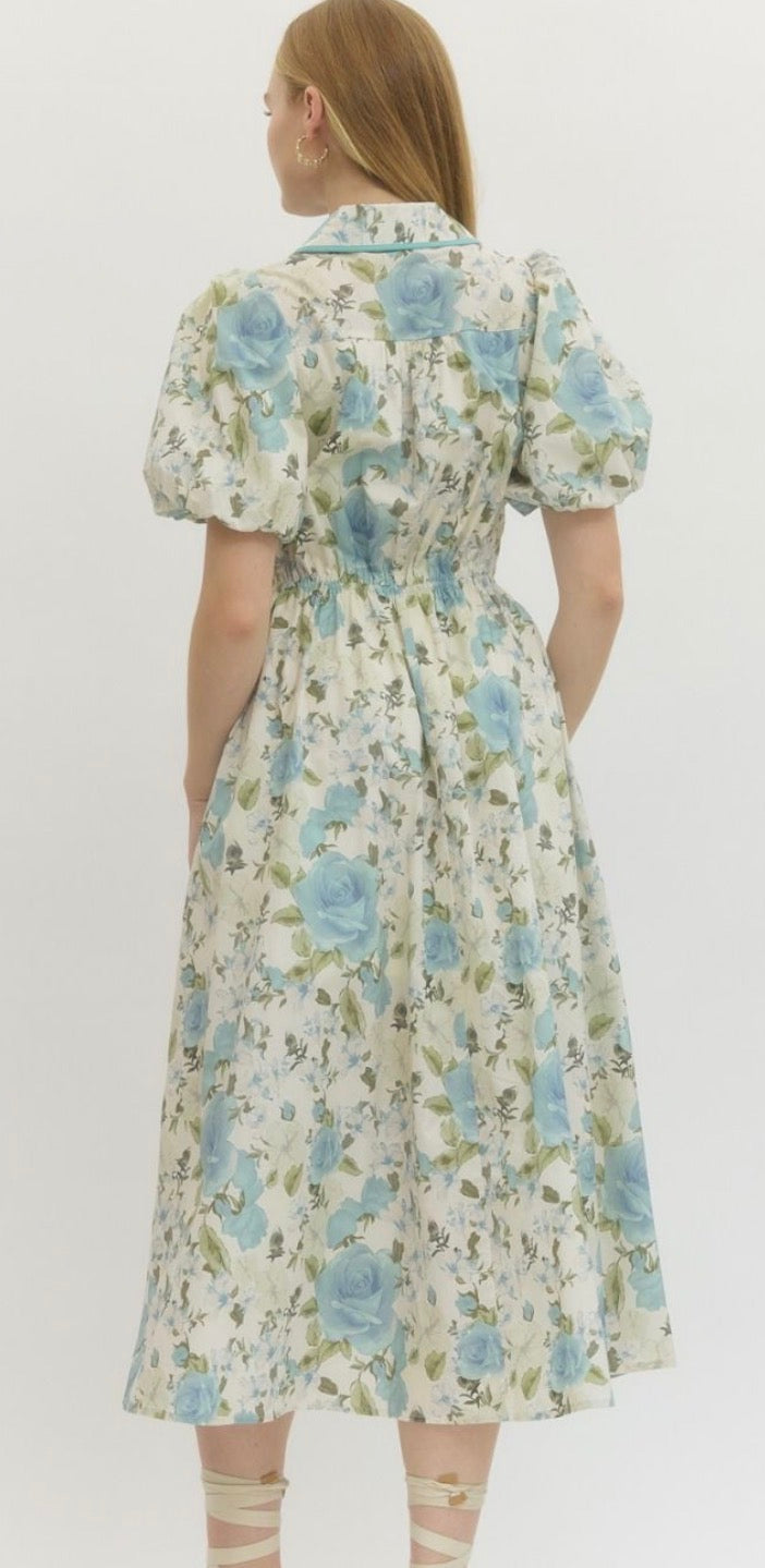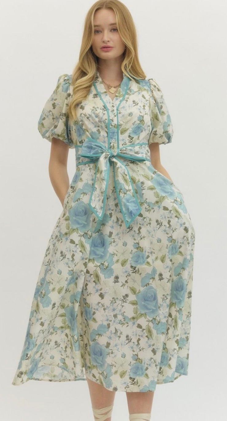 Floral print short puff sleeve midi dress featuring contrast binding at neckline and front with self-tie sash at waist. Button closure at front. Side pockets. Elasticated back waist. Lined. Woven. Non-sheer. Lightweight.