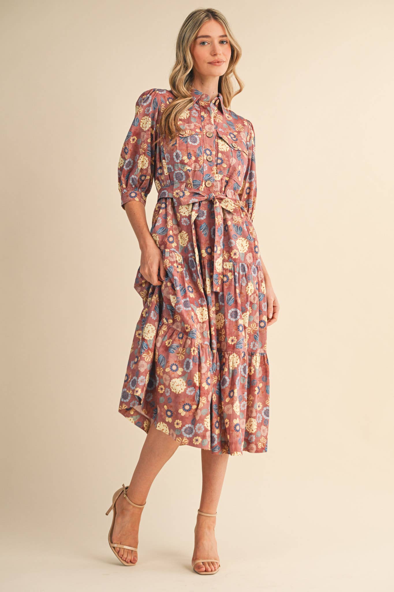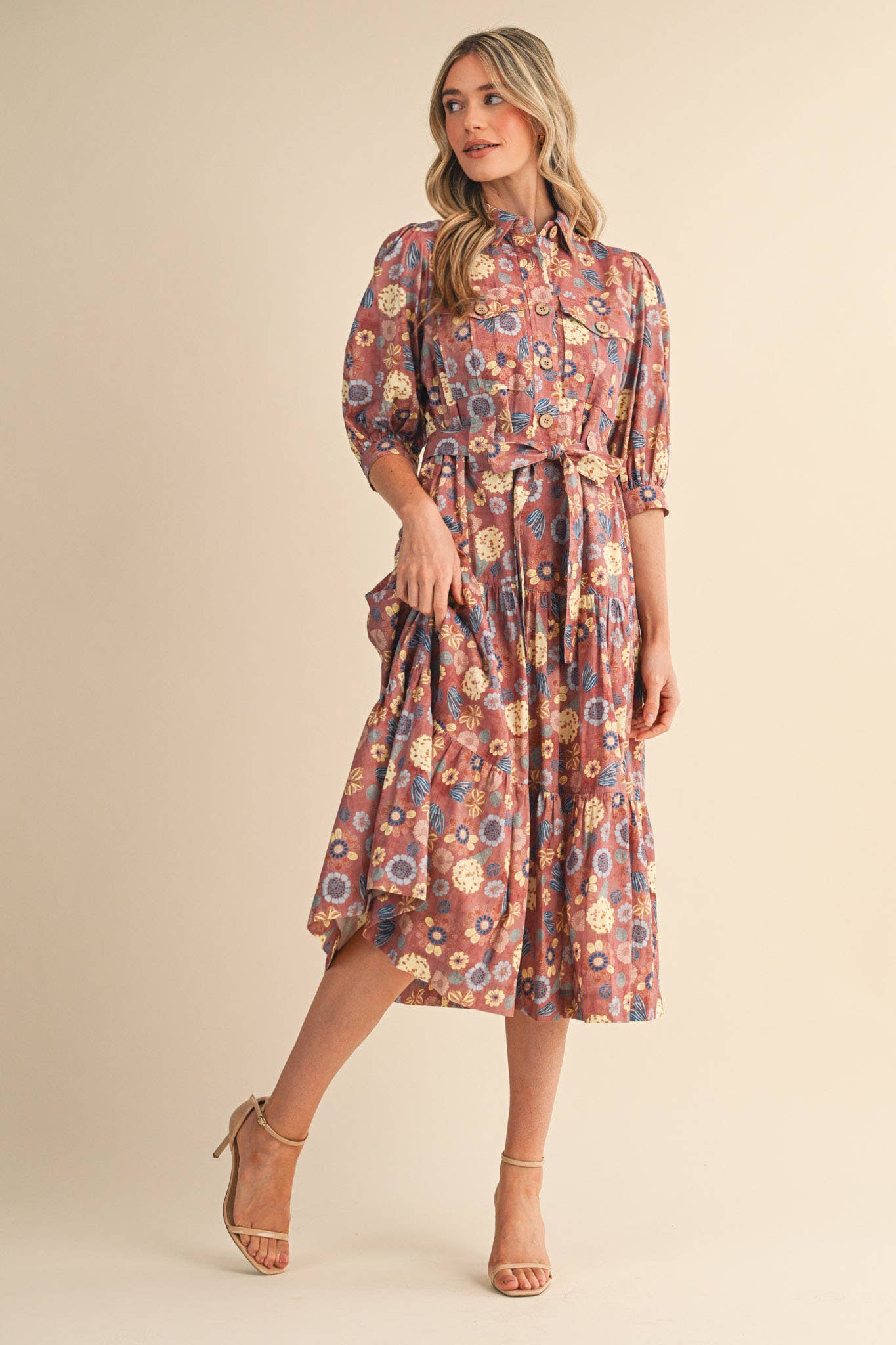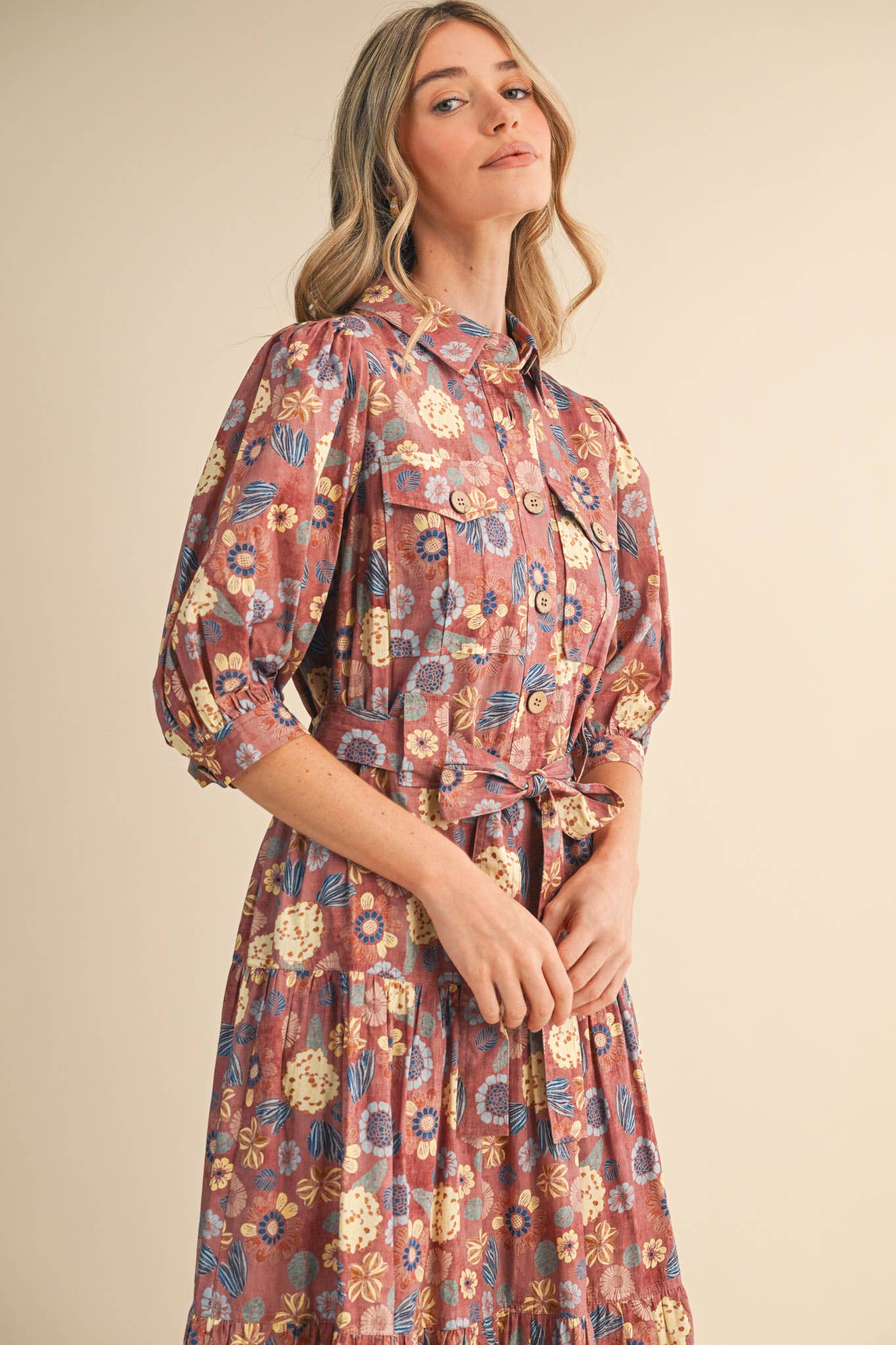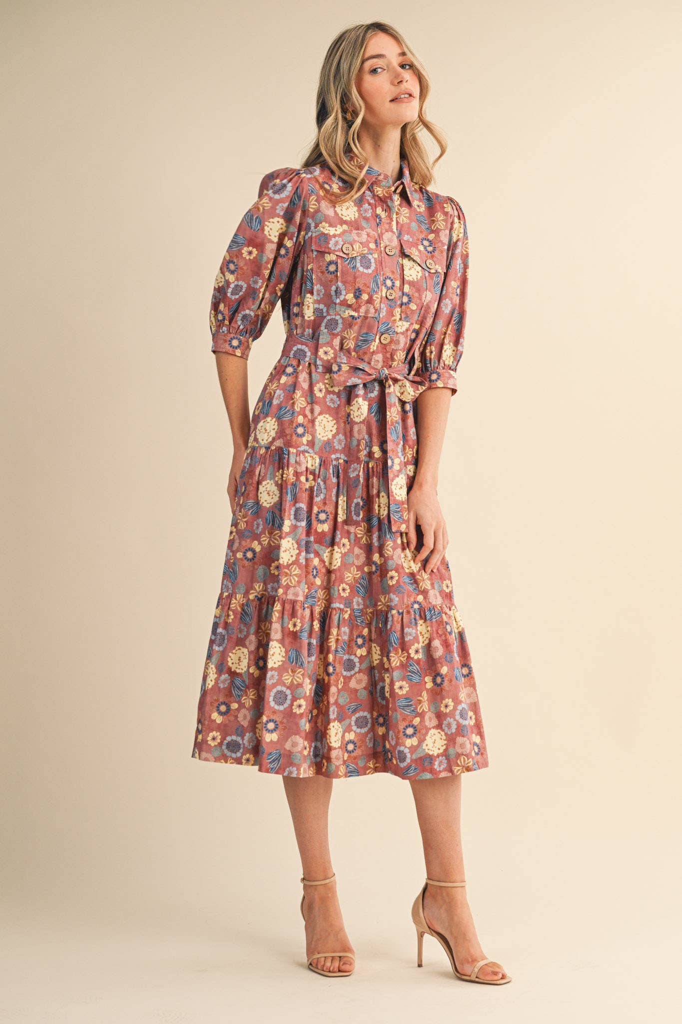 + Floral print shirt midi dress + Collared neckline with button down placket + Front flap pockets + Tying sash around waist with wide belt loops + Elbow length puff sleeves with buttoned cuffs + Tiered midi hem + Pockets + Lined