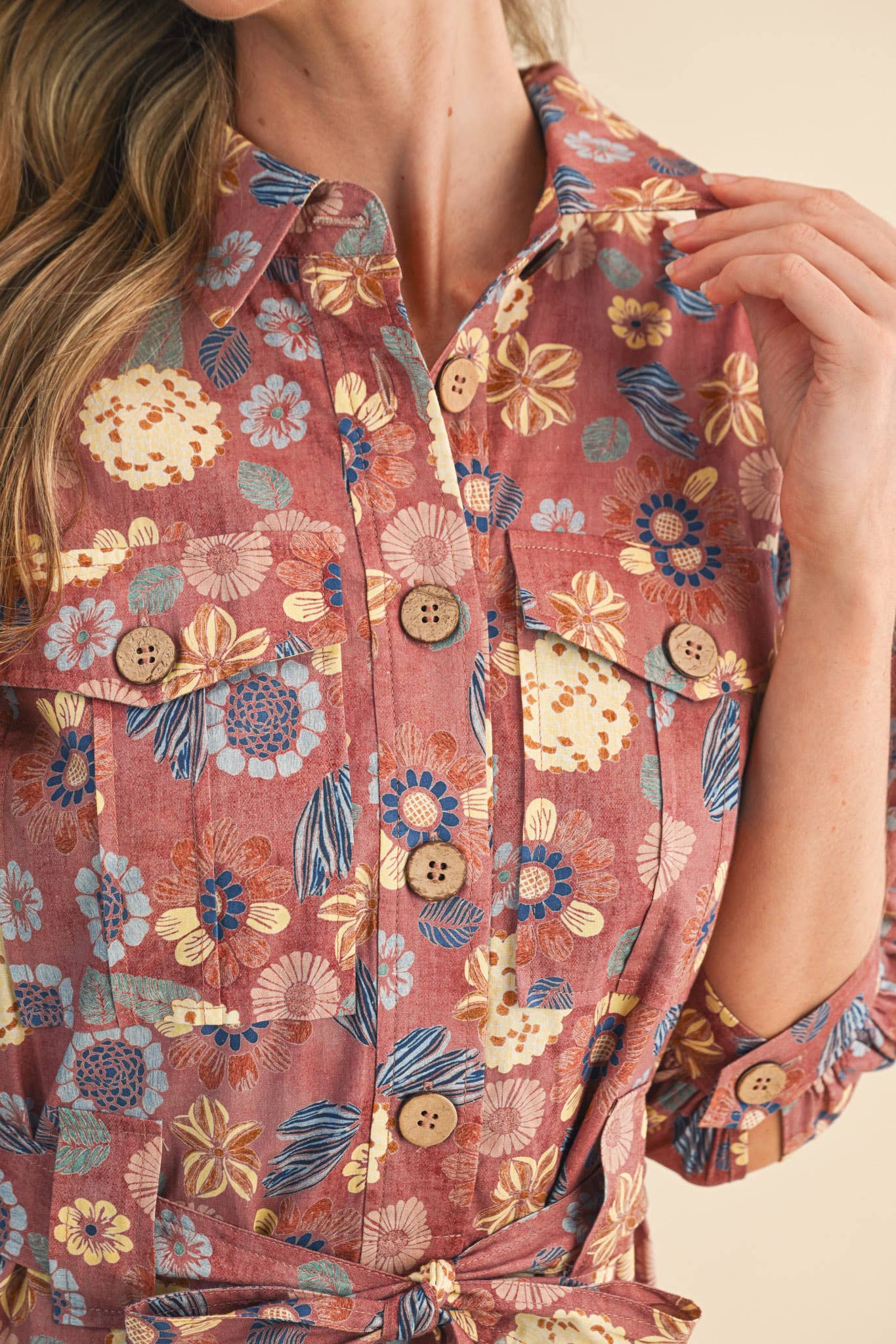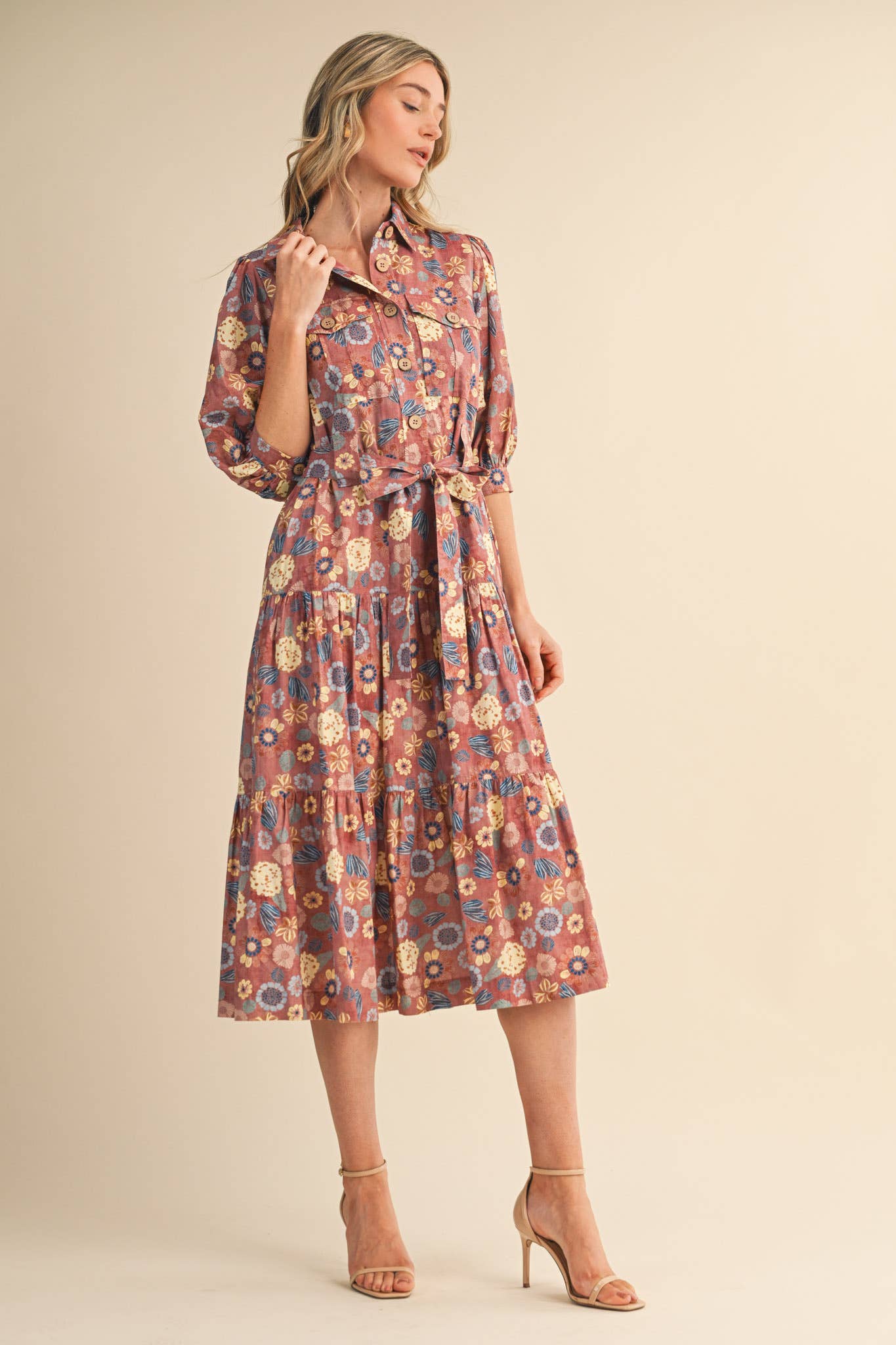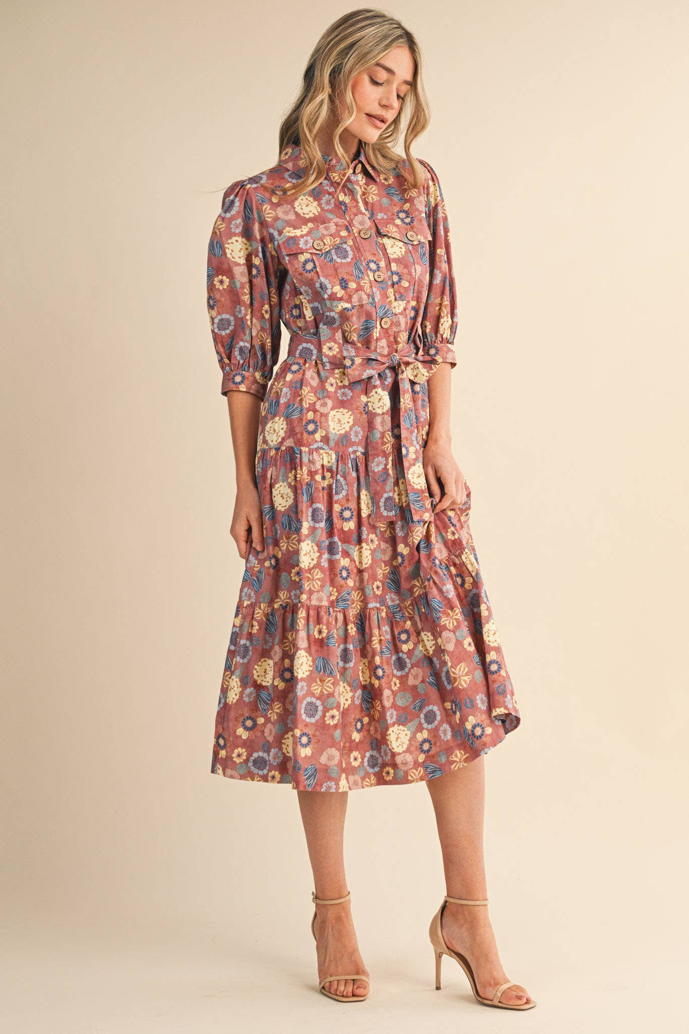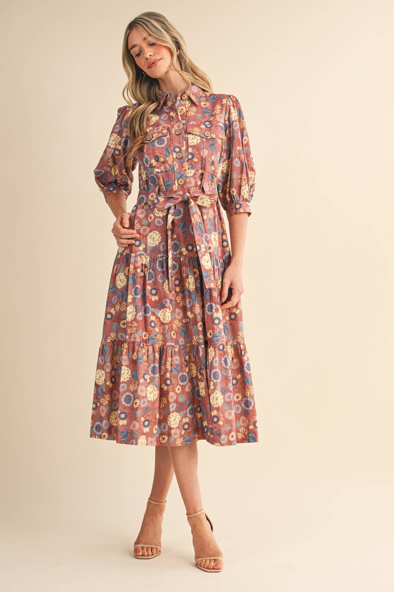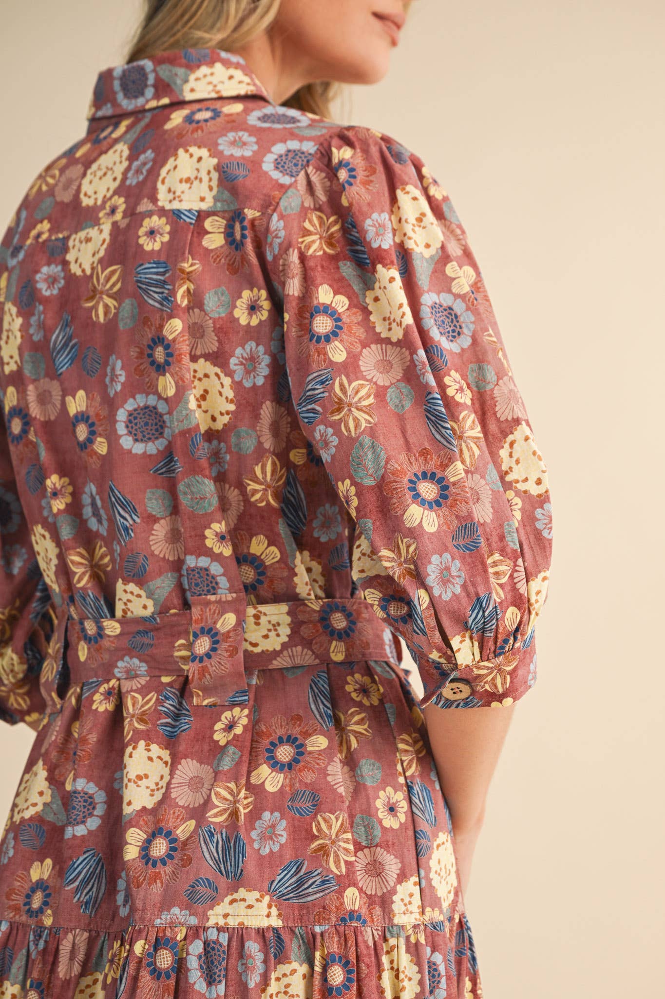 + Floral print shirt midi dress + Collared neckline with button down placket + Front flap pockets + Tying sash around waist with wide belt loops + Elbow length puff sleeves with buttoned cuffs + Tiered midi hem + Pockets + Lined
