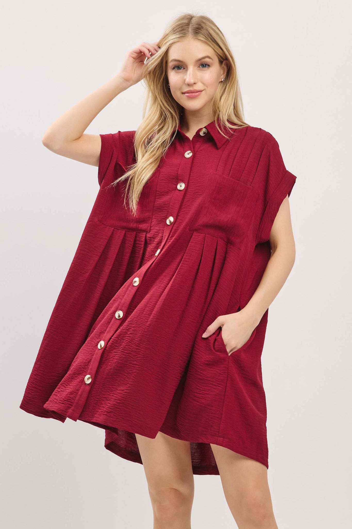 Breezy, bold, and made for game day. This shirt dress is crafted from lightweight airflow fabric with a crinkle texture that keeps you cool and comfortable all day long. Featuring a collared neckline, rolled short sleeves, and a full button front, it's styled with front chest pockets and a relaxed fit that makes it easy to throw on and go. Available in multiple vibrant colors perfect for team spirit or casual weekend vibes. gameday dress, button front dress, shirt dress, airflow dress, crinkle dress, casual gameday outfit, collared dress, short sleeve dress, relaxed fit dress, colorful dress, tailgate outfit, comfy team dress, breathable fabric dress