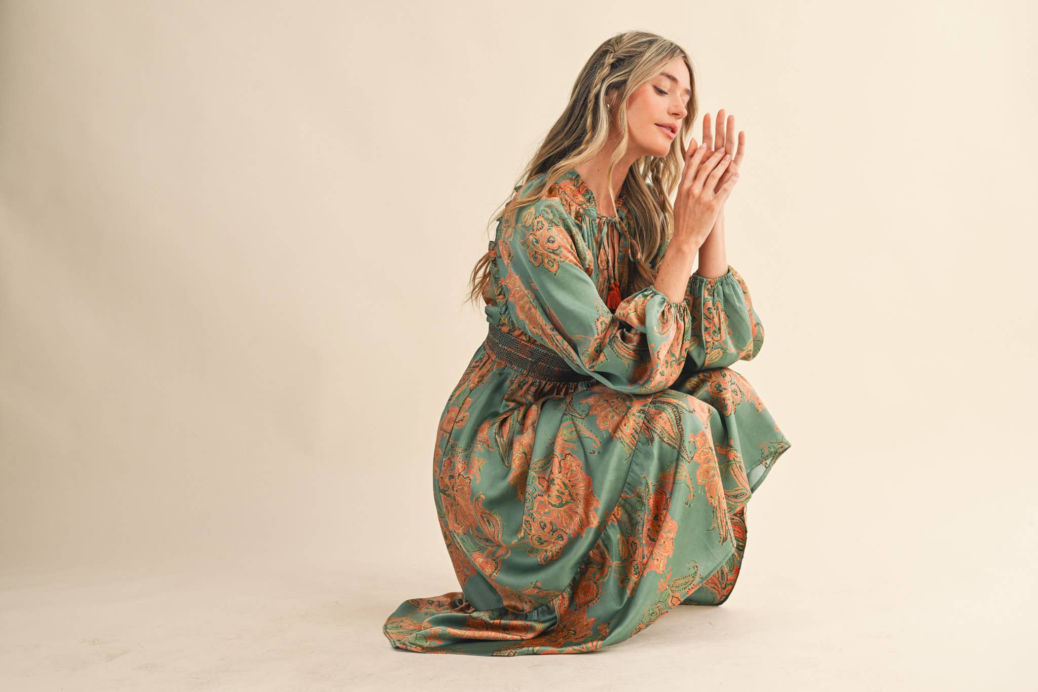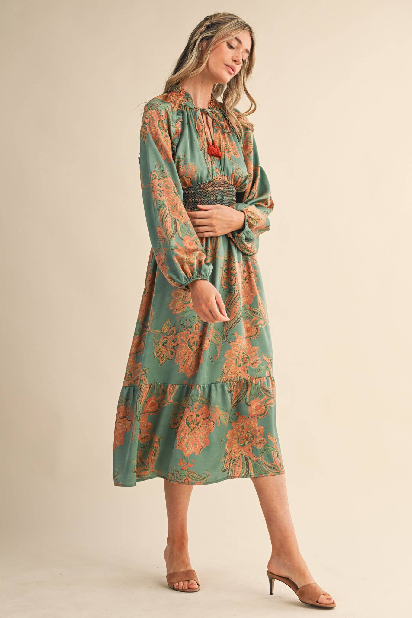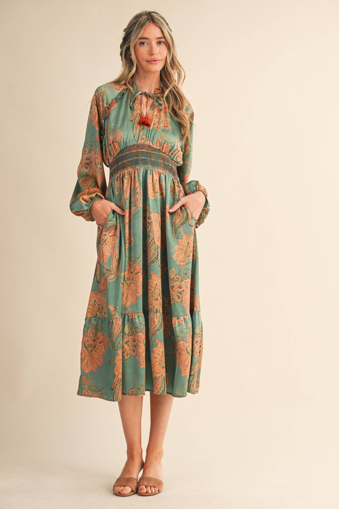 + Paisley print smocked midi dress + Ruffled neckline with notched V and tying tassels + Smocked elastic panel waistband + Long puff sleeves with elastic cuffs + Ruffle trim raglan seam + Long ruffle midi hem + Pockets + Lined