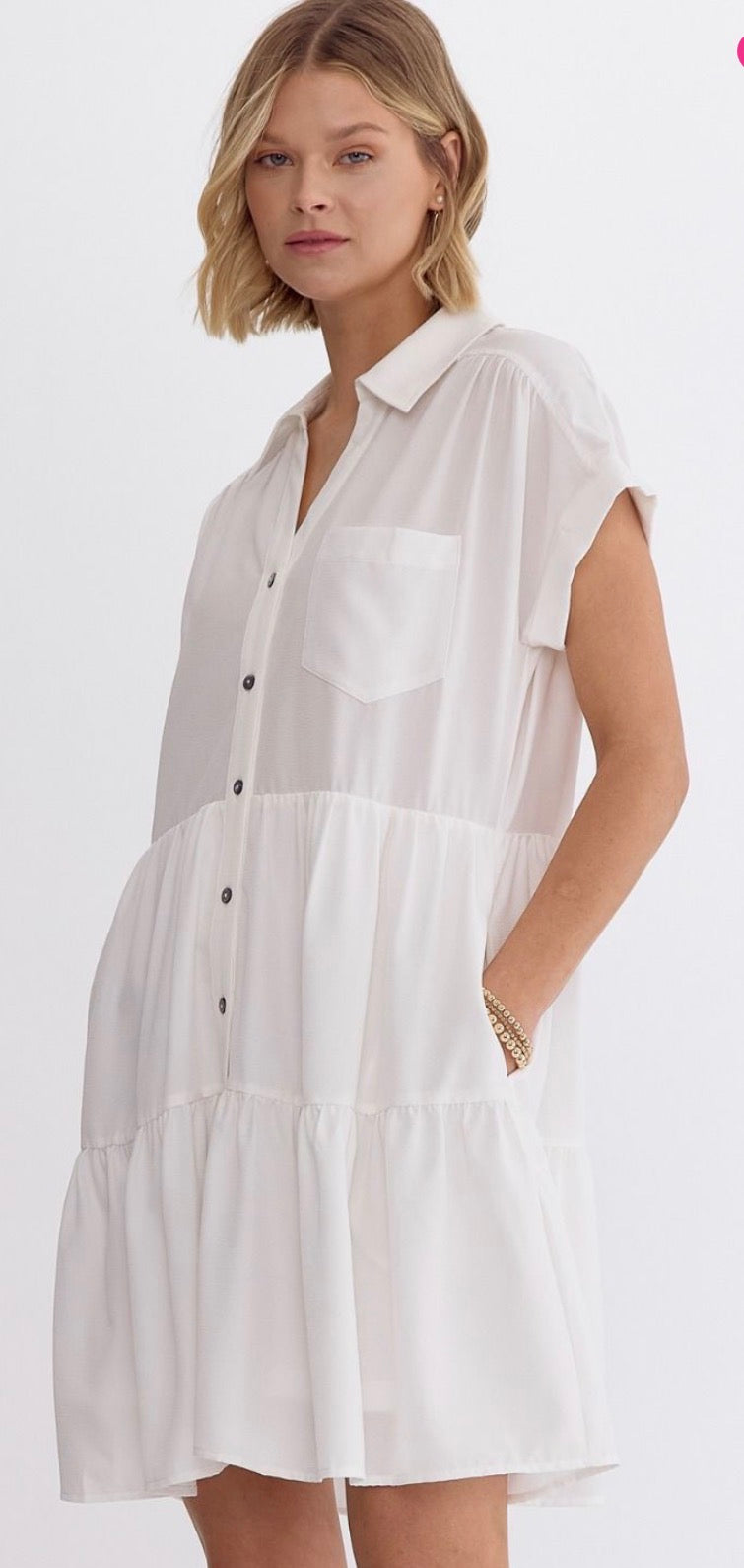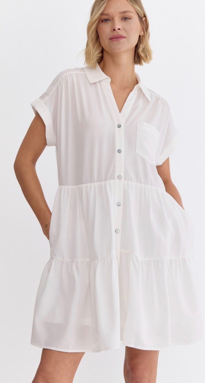 Solid collared button up mini dress featuring single pocket at bust. Permanent rolled up cuff. Pockets at side. Lined. Woven. Non-sheer. Lightweight.