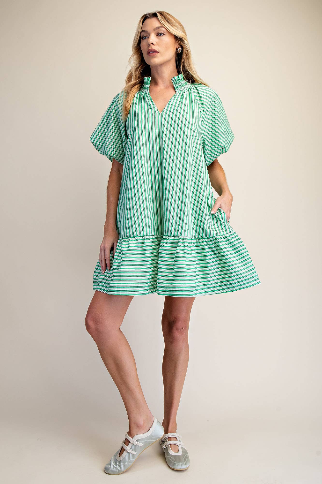 Ruffle Smocked V-Neck Short Sleeve Stripe Mini Dress *Side Pocket