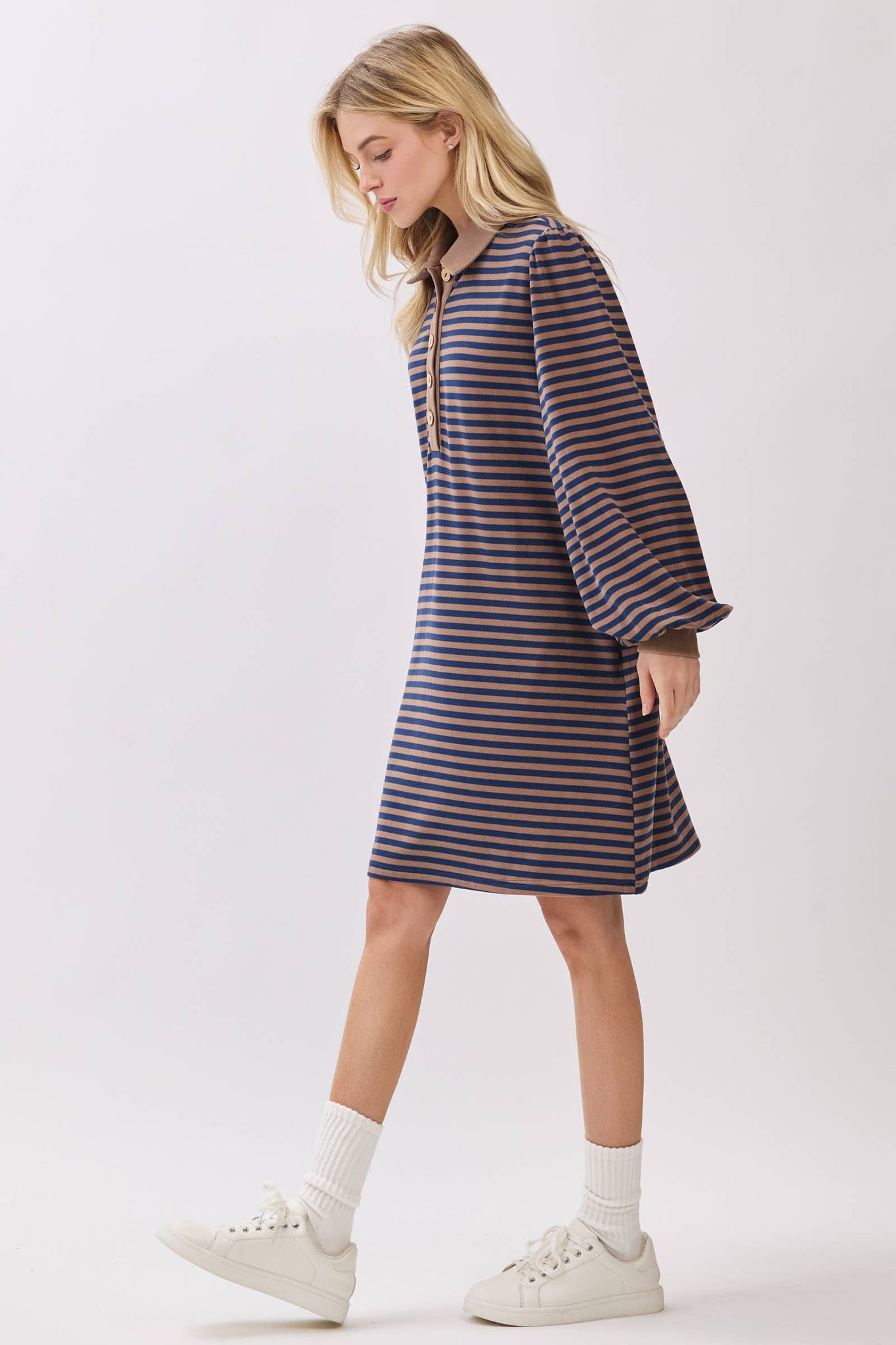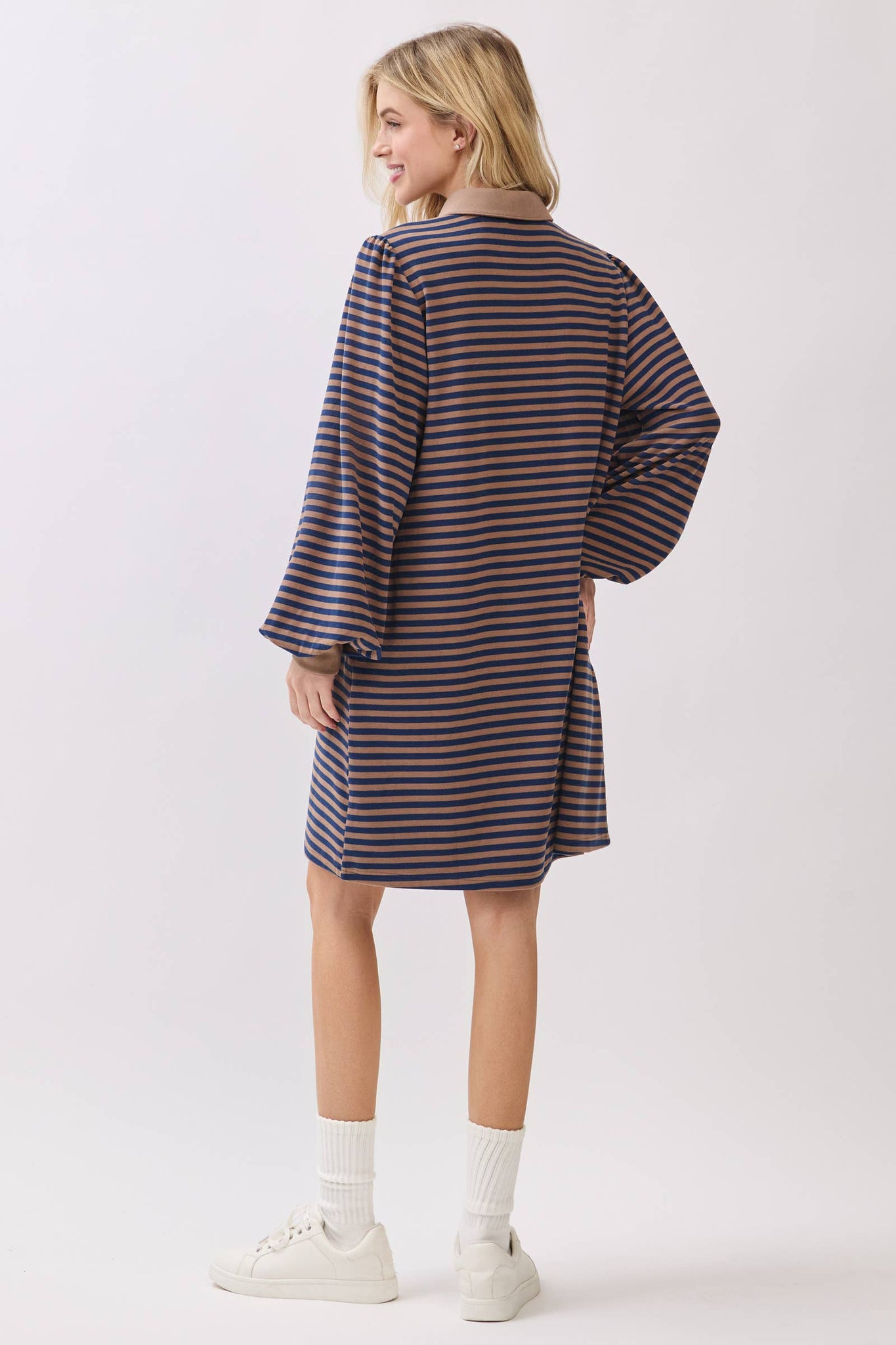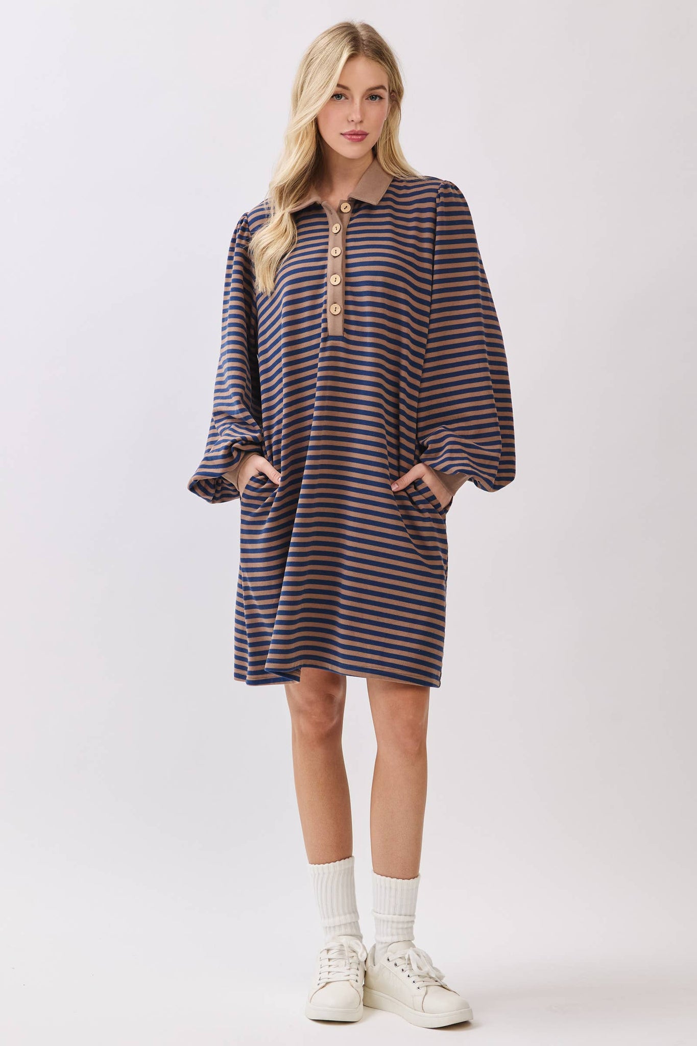 This oversized striped polo dress features shirring on the shoulders and voluminous bubble sleeves for a relaxed yet feminine silhouette. Designed with a comfortable fit and casual style, it's the perfect everyday piece that blends ease with modern detail. oversized polo dress, shirred shoulder dress, bubble sleeve dress, relaxed fit dress, casual polo dress, everyday wear, free people style dress, gameday dress, fall dress, holiday casual dress, trendy oversized dress, comfy chic