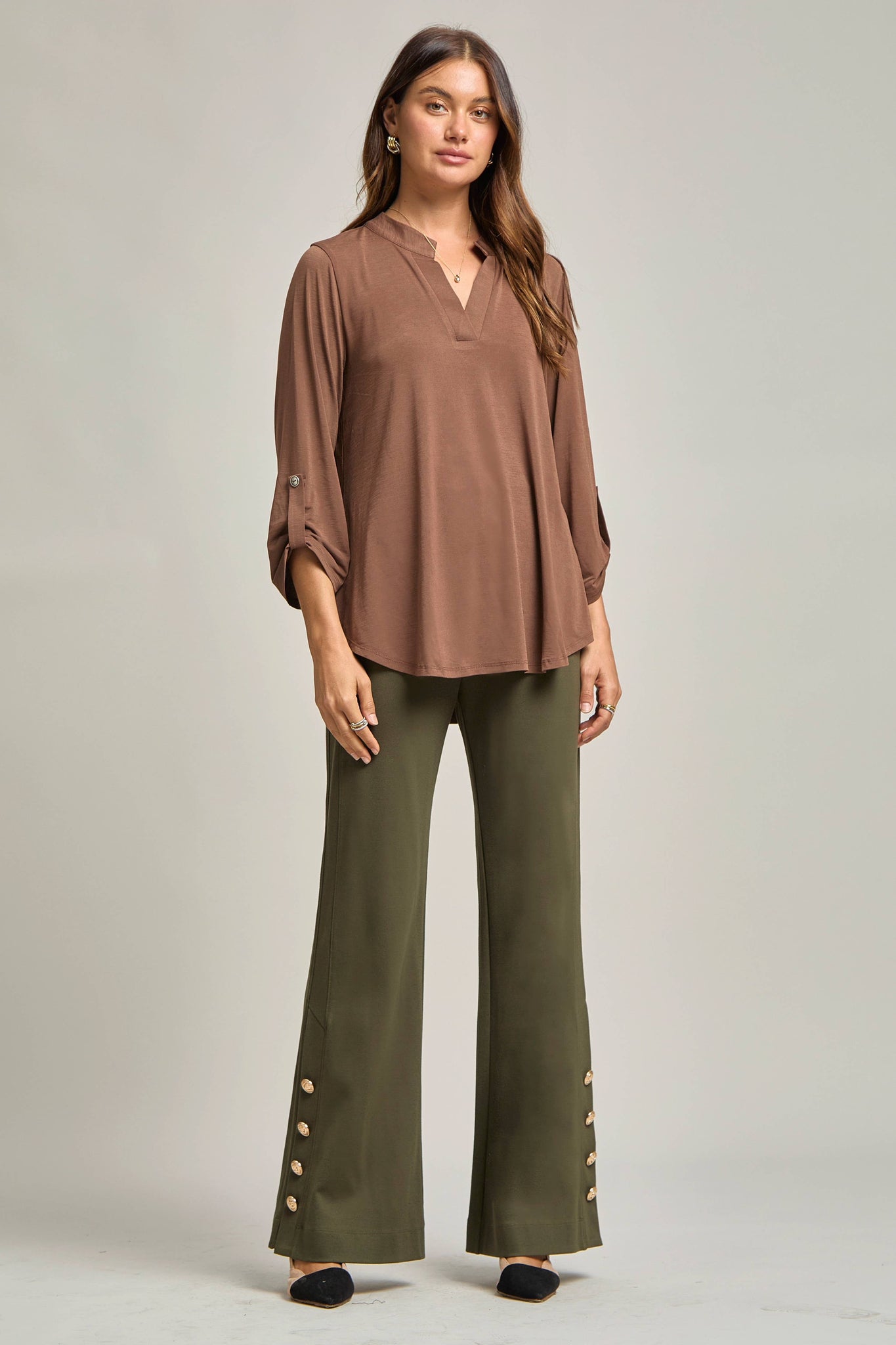 Our signature Lizzy Top is crafted from a soft, luxurious poly blend that offers lightweight, wrinkle-free comfort. Designed for easy care, this travel-friendly top is cooler than linen, making it the ultimate choice for life on the go. The Lizzy also features a mandarin collar neckline and 3/4" length sleeves with tab details. Its relaxed, flowy fit and subtle high-low hemline ensure a flattering silhouette for any occasion.
