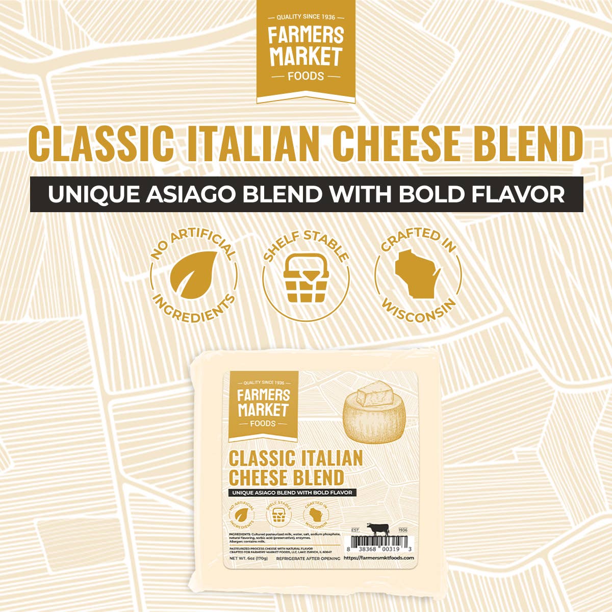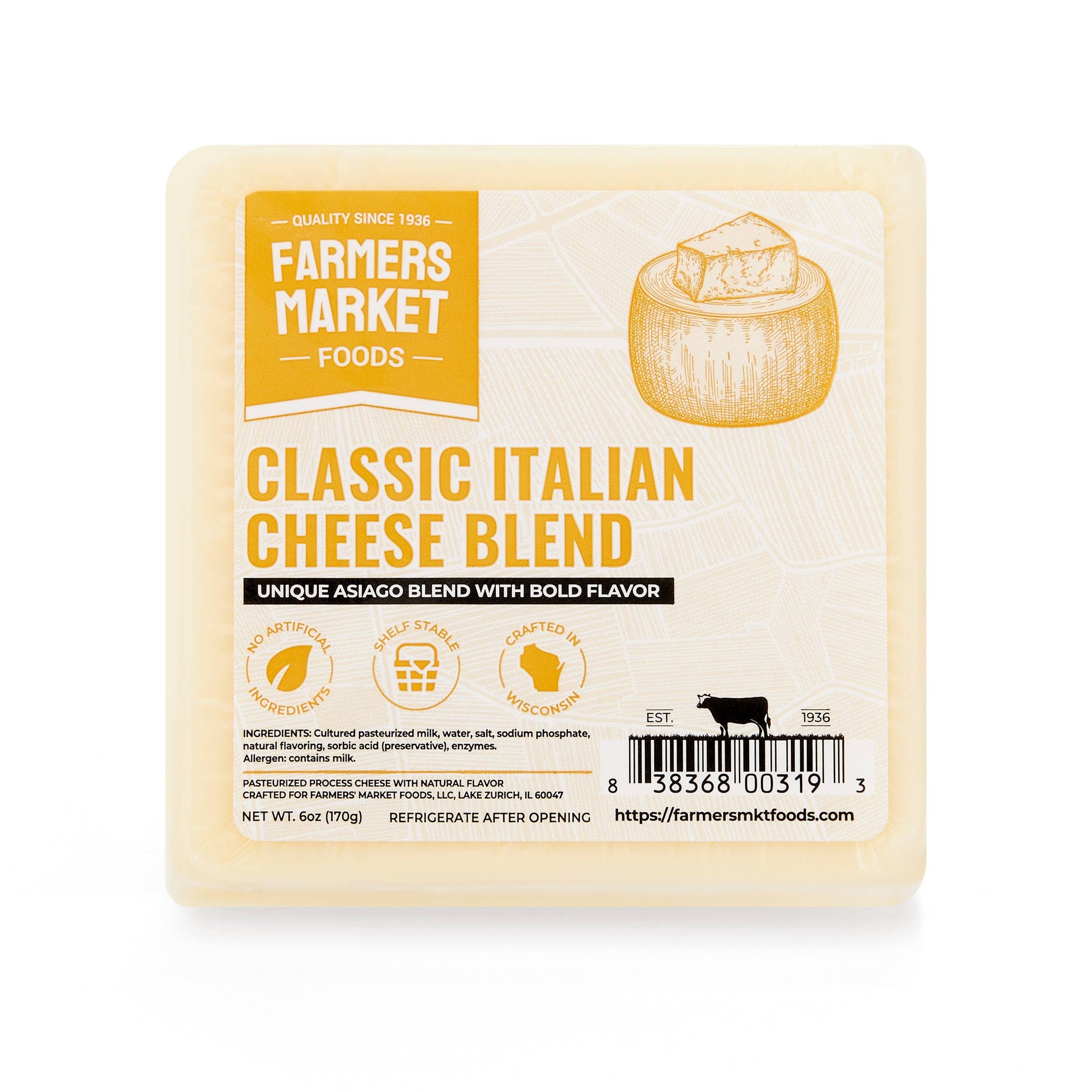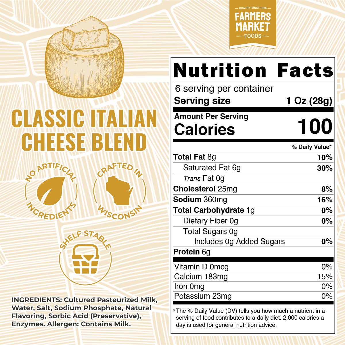 Shelf stable non-GMO Wisconsin cheese with no artificial ingredients, low sugar, gluten free, keto- and paleo- friendly. Our Classic Italian Cheese Blend is a heartfelt tribute to Italian heritage and old-world Wisconsin cheesemaking. Each 6oz block features a harmonious trio of Italian-style cheese flavors like Parmesan, Romano, and Asiago. This rich, savory blend melts beautifully and enhances every dish. It’s ideal for pasta nights, antipasto platters, gourmet gift baskets, or everyday snacking. 6 oz