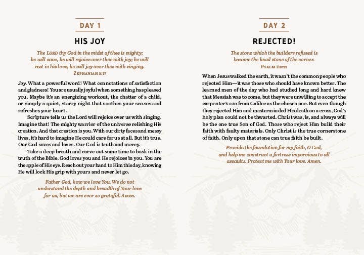 In an increasingly challenging world, you need encouragement every day. Here is a year’s worth of inspiring devotions. Daily Encouragement for Men contains 365 readings, each based on the classic King James Version of scripture, covering a myriad of spiritual and practical aspects of life: joy giving prayer rejection conversation faith sadness your value in Christ These powerful contemporary devotions are accompanied by brief prayers to jump-start a conversation with your heavenly Father. And what could be more encouraging than that?