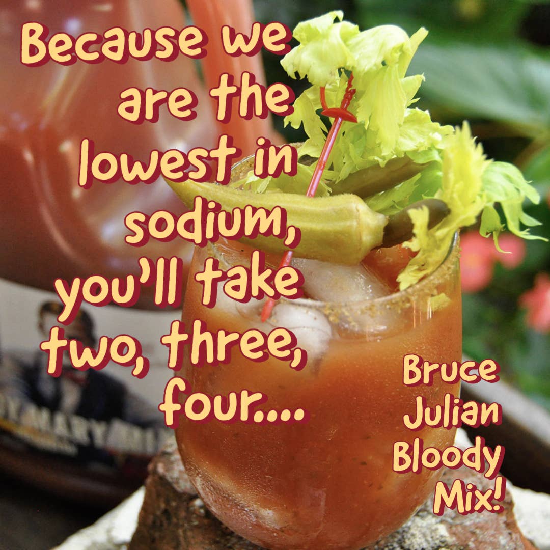 Bruce Julian Bloody Mary Mix is a North Carolina handcrafted Southern Classic. Finally, here’s a sophisticated mixer that starts out sweet and finishes savory. Try it on its own or slosh in a little vodka (we like tomato or cucumber flavor!); prime your glass with Bruce’s own Rimmer; garnish with a piece or two of our Sassy Okra; and kick back: Our delicious blend instantly conjures a lazy Sunday morning on the porch, no matter where you happen to be doing your sipping. Our Weekender is the ideal size (One-Gallon) for your tailgating party, weekend getaway, and brunch with family and friends.