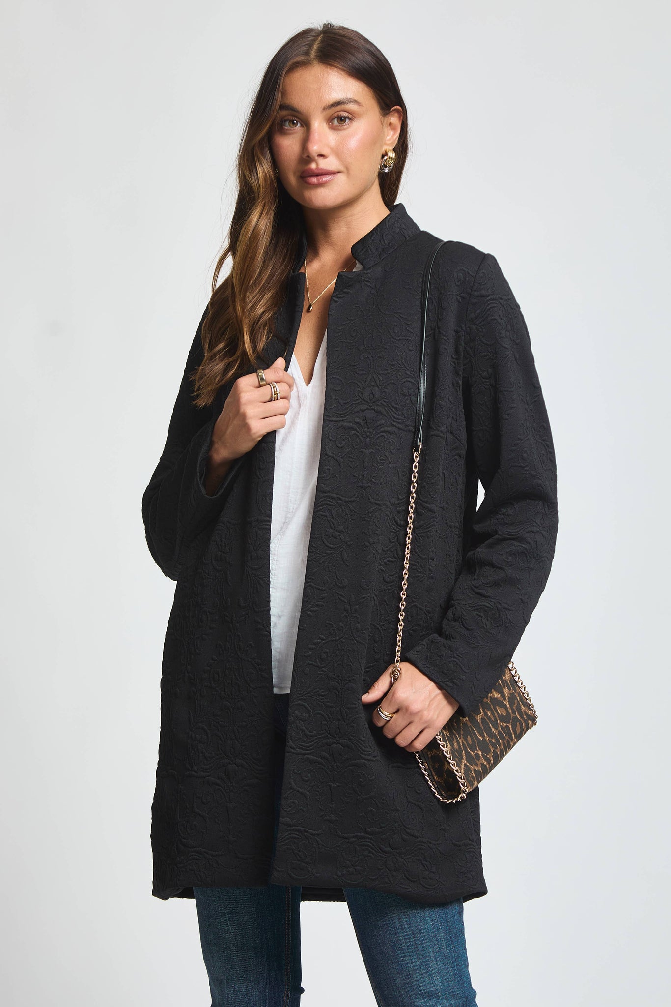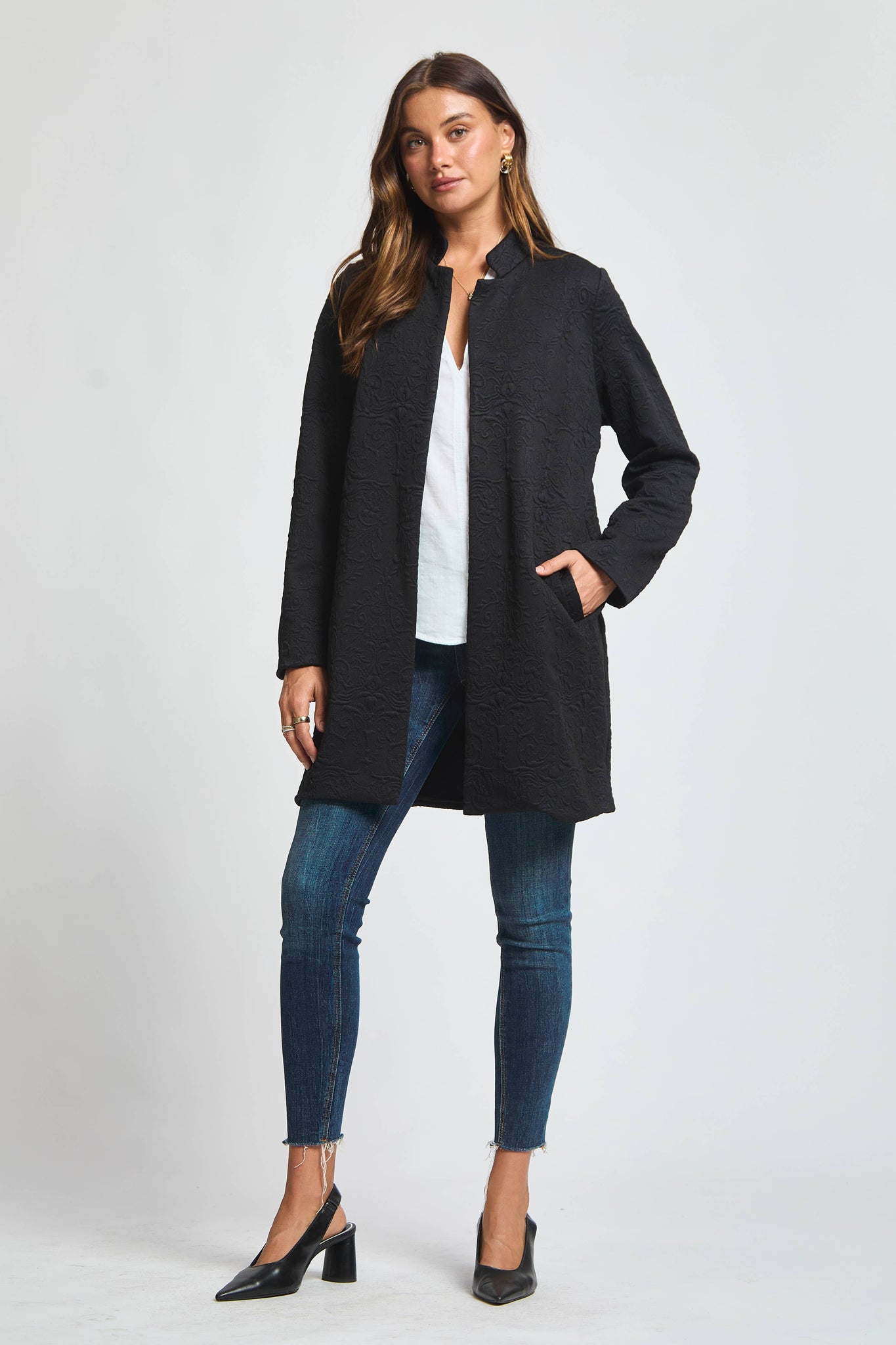 Make a statement in this elegant jacquard midi coat, where intricate texture meets timeless design. This rich pattern fabric brings depth and sophistication to your outerwear collection. This midi length offers graceful coverage, while the structured silhouette and refined detailing create a polished look.