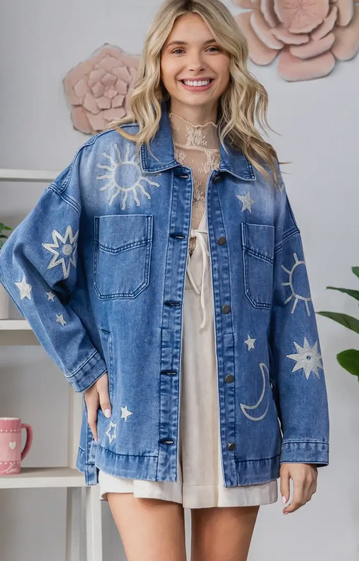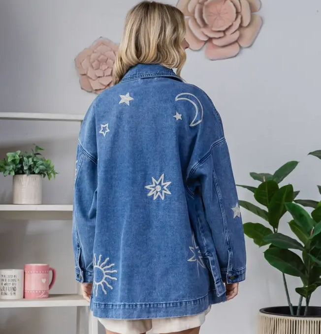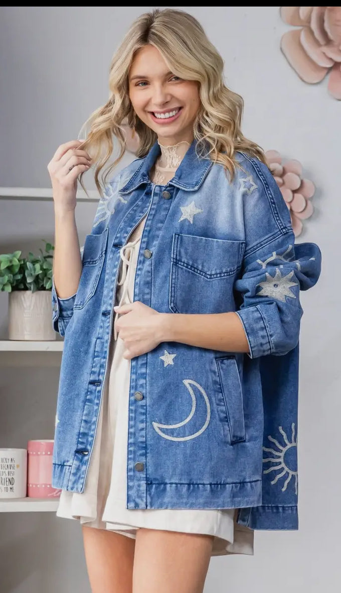 Embroidered denim jacket with stars, sun and moon. Pockets. Embroidered denim is so hot and trending on TikTok.