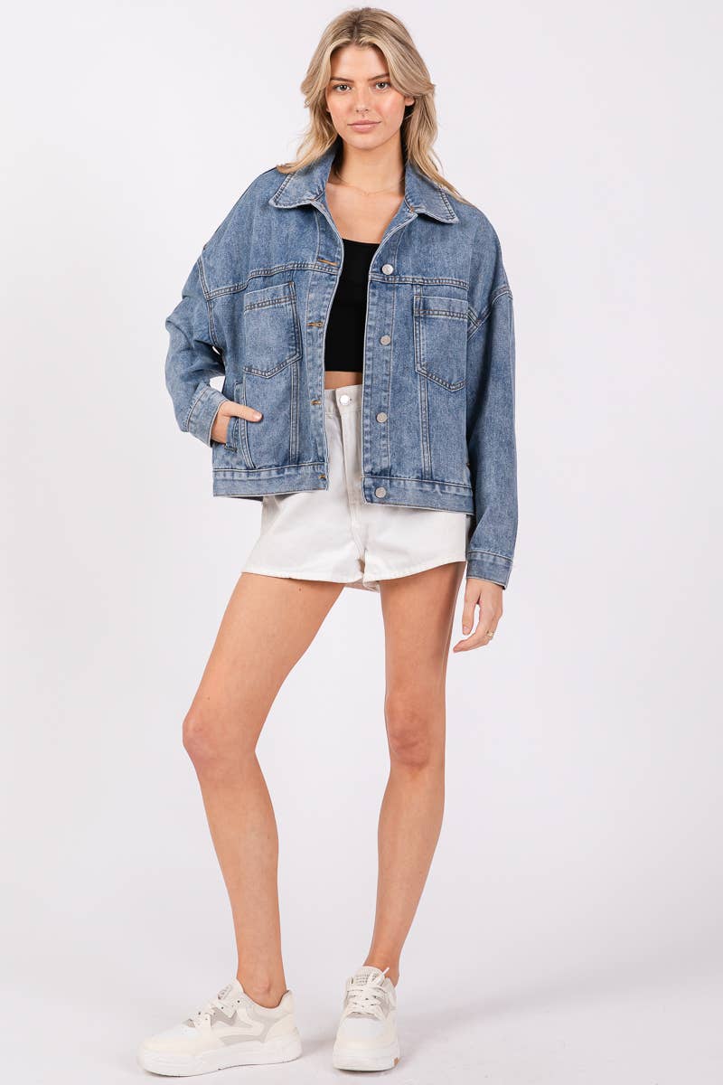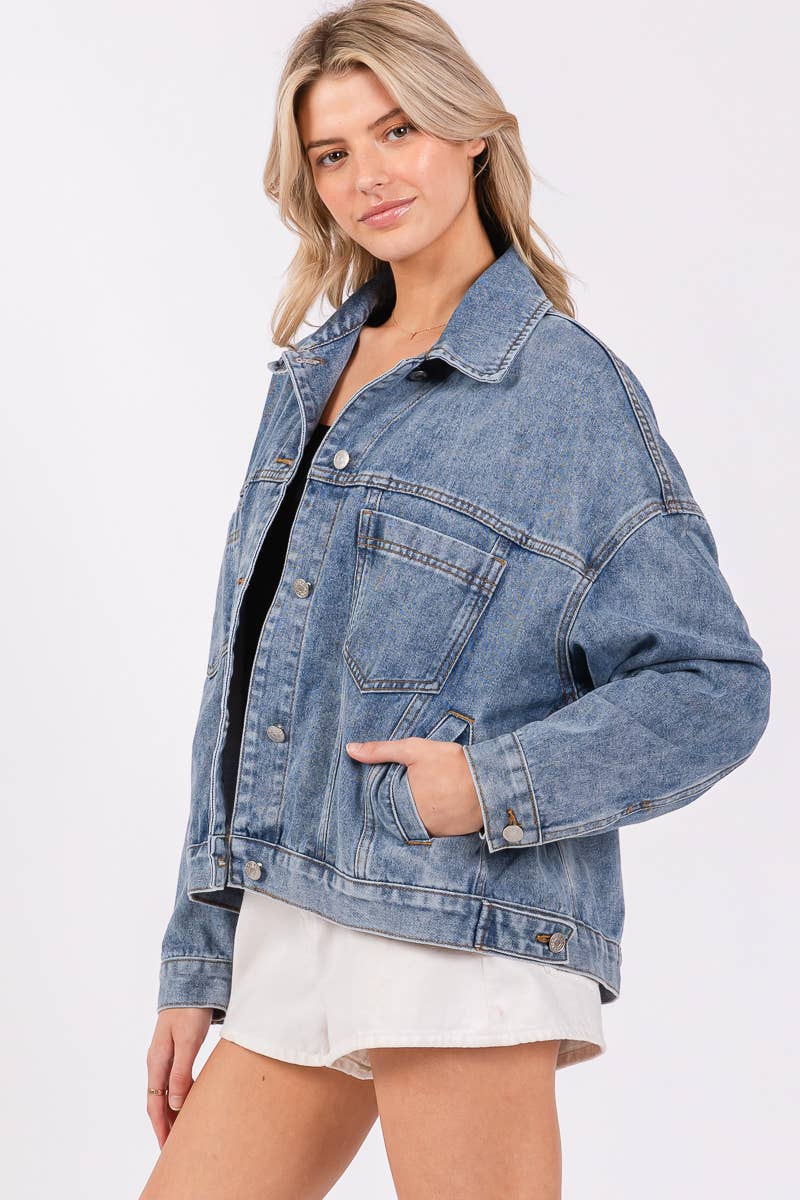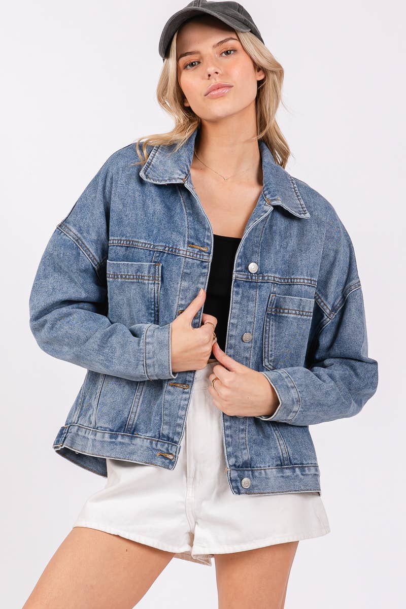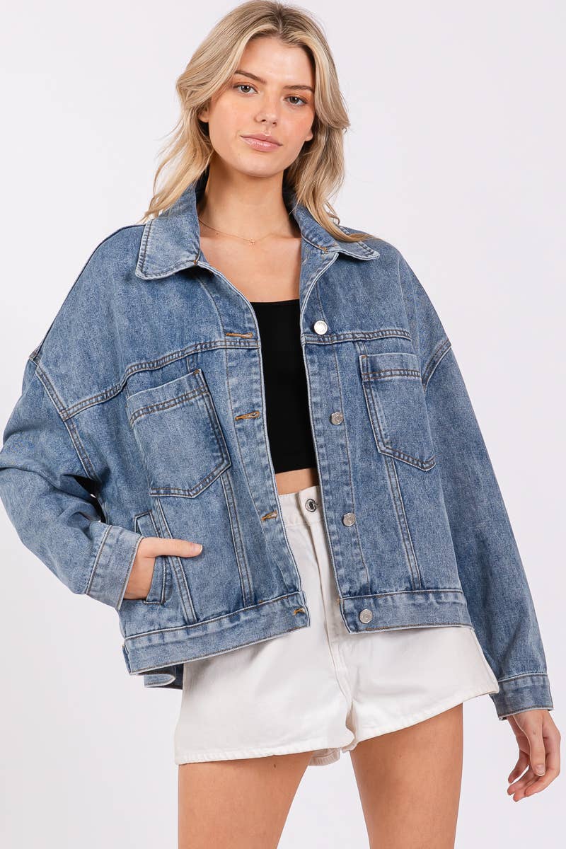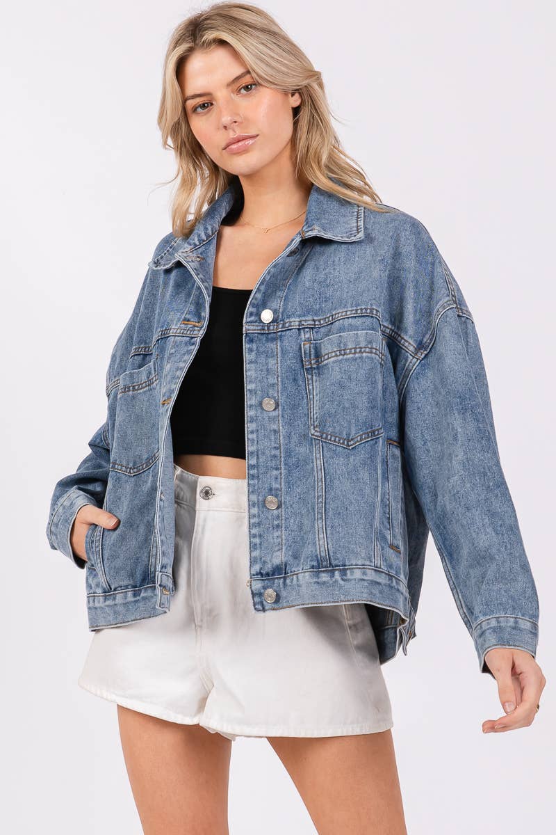offering a relaxed silhouette with a slightly oversized fit. Crafted from durable, washed denim, this jacket features classic details like button closures, chest pockets, and side pockets. It's perfect for layering over casual outfits, adding a touch of effortless style to your look while providing comfort and warmth.
